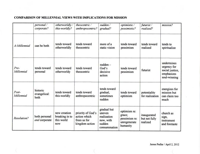 Using these sets of “tensions,” I’ve developed the following analysis of the millennial positions, with my suggestions regarding how potential strengths of each view could be integrated. This probably needs further explanation in a separate post, but I’ll leave it here for now – comments and suggestions would be welcome.